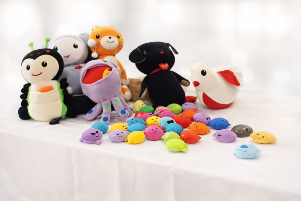 Les enfants interagissent avec les personnages KIMOCHIS®, représentés par des peluches.
